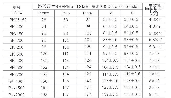 BK系列機(jī)床控制變壓器(以下簡(jiǎn)稱變壓器)適用50-60Hz電壓至500V的電路中,通常用作機(jī)床控制電器或局部照明燈及指示燈的電源之用。BK變壓器結(jié)構(gòu)可分為殼式;按安裝方式可分為立式。旗正牌BK控制變壓器型號(hào)具體已列下圖里,詳情看下圖!